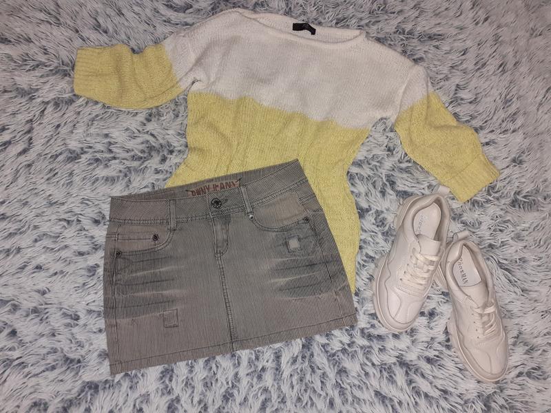 Стан відмінний. Спідниця, дуже стильна. Довжина ззаду 32, спереду 30, ПІТ 37, ПОБІДИ 45. Джинс трохи тягнеться. Спереду і ззаду кишені. Перешлю