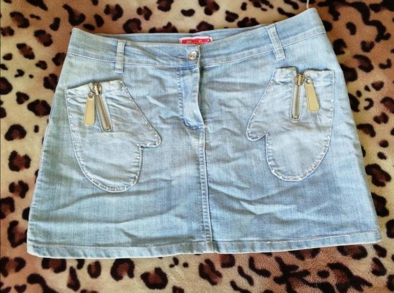 Джинсова спідничка міні світло блакитного кольору, декорована кишенями у вигляді рукавичок. Розмір вказано 42, наш~48. 📏Піт 42 див. Напівобхват низу 51-52 див. Довжина 35 див.
