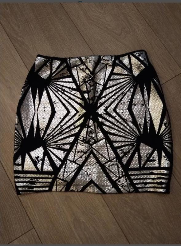 Міні-СПІДНИЦЯ з щільного трикотажу!! Спереду - накатка сріблястого кольору у вигляді абстрактного малюнка, ззаду - фактурний трикотаж-букле. Відмінно тягнеться і облягає фігуру. Розмір 46-48, ПОТ - 33 см (тягнеться до 50 см), ПОБІДИ - 45 см (тягнеться до 57 см), довжина - 40 див.