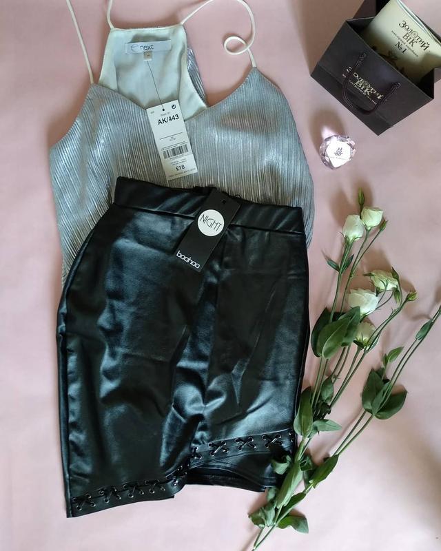 Ефектна сексі спідниця BOOHOO, шкір.зам р-р 12 ,нова з біркою. -ПРО-96-98 -пояс-33,5 см гумка -довжина-40 там де подовжена-48см