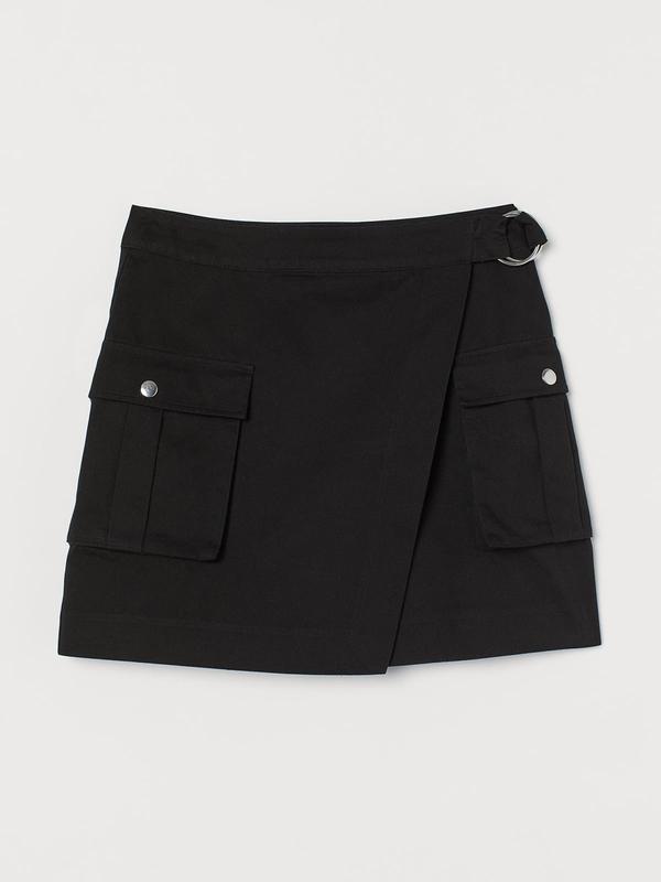 Короткая юбка из мягкого хлопкового твила. Модель с высокой талией на запахе, с потайной пуговицей и пришитым ремнем с металлическими кольцами и накладными карманами с клапаном на кнопке. Без подкладки.