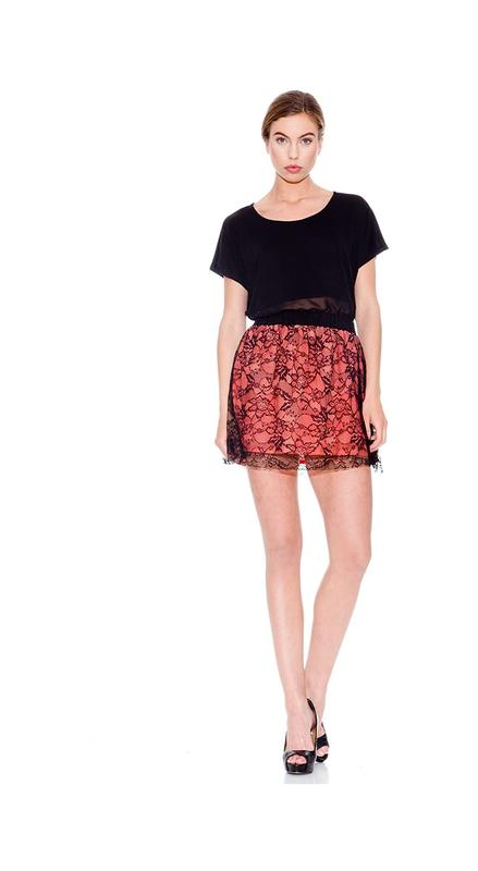 Спідничка mango коралова з чорним кружевом на резинці, розмір XS/S Заміри: •пот 31+ •поб 50 •довжина 39/43(кружево) Склад: • кружево: 100% поліамід •підкладка: 100% котон За деталями звертайтесь!