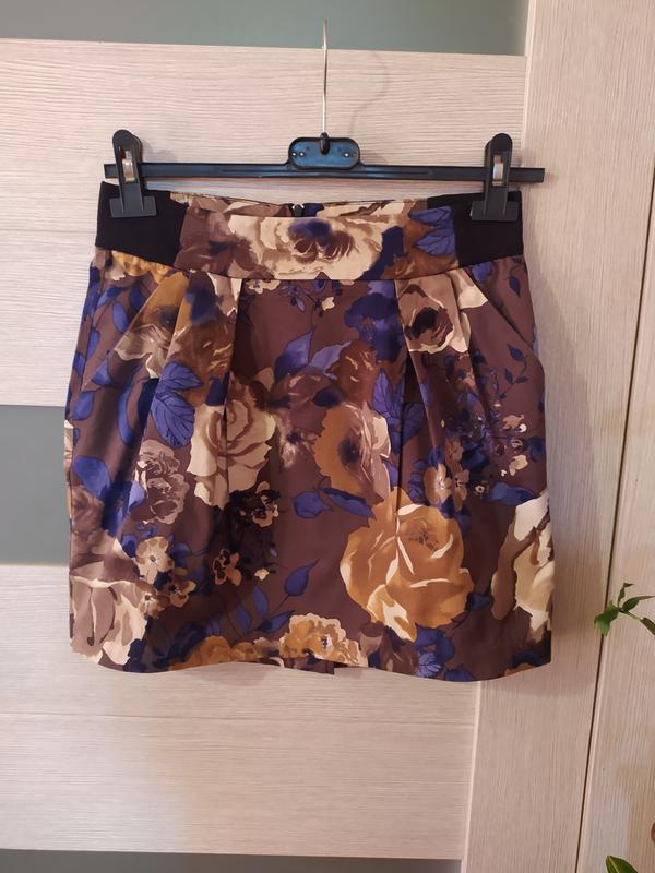 Спідничка-міні, актуальний принт в квіти, дуже зручна і стильна, на фігурці сидить відмінно. Розмір вказано 34, дивіться на заміри. У поясі є трикотажні вставки, блискавка ззаду, з боків-кишеньки. піт 35 побіди 46 довжина 42
