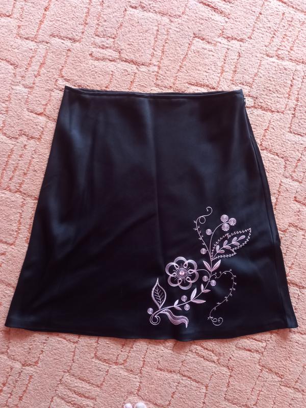 Супер спідничка з вишивкою,дуже приємна тканина,тягнеться, всередині як оксамитова,верх гладкий довжина 54см,пояс 80-85см,збоку потайна блискавка,стегна 110см вільний фасон