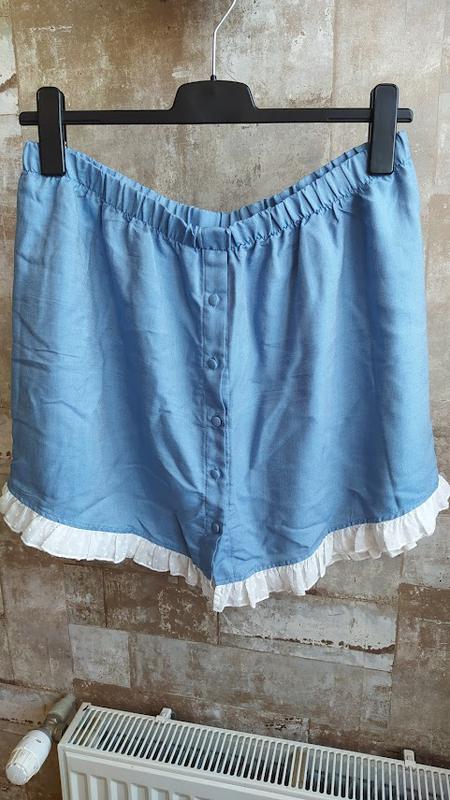 Красива спідниця з оборкою. В талії резинка, спереду декоративні ґудзики. Заміри: талія - 43 см (тягнеться до 62cm) ПОБІДИ - 67см, довжина - 45см Склад тканини: 61% лиоцелл 39% бавовна