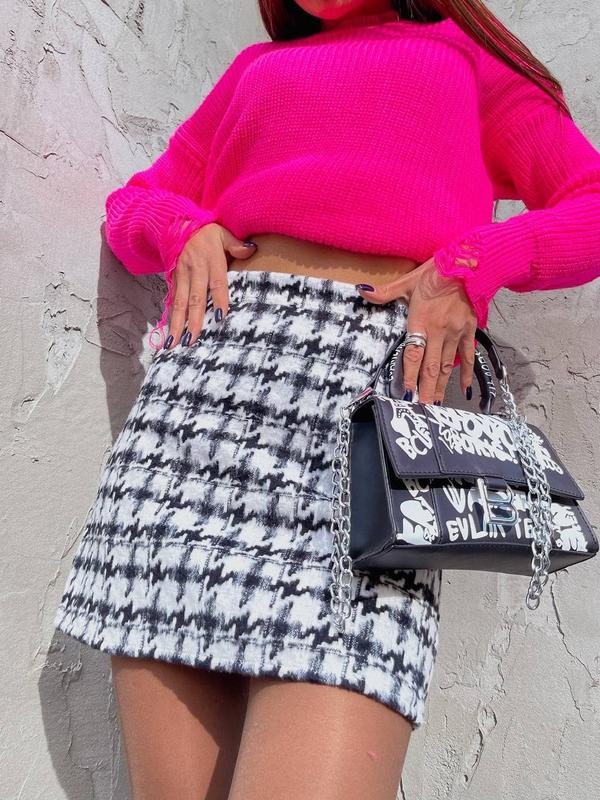#Спідниця Артикул: 502-205 Колір: чорно біла клітка Розміри: 42-44 та 44-46 Матеріал: твід Довжина 43 см