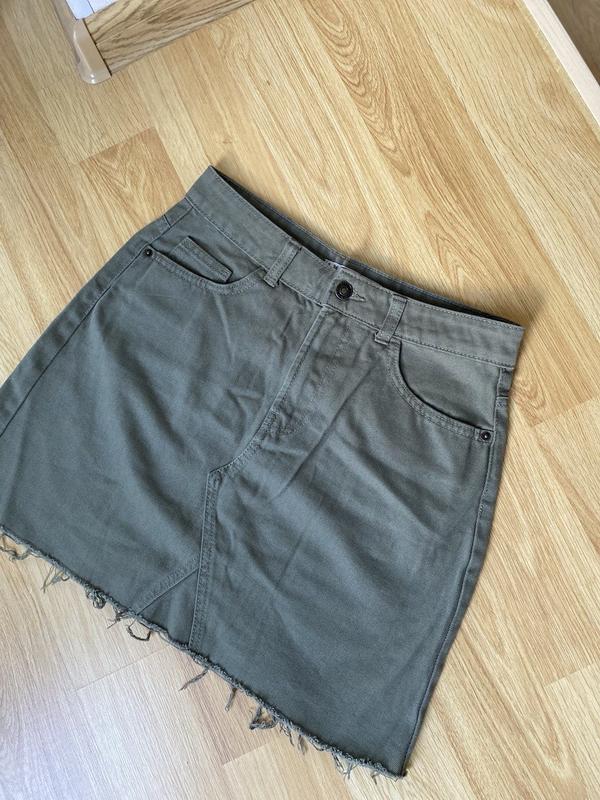 Юбка кольору хакі, низ ніби рваний. Джинсова.