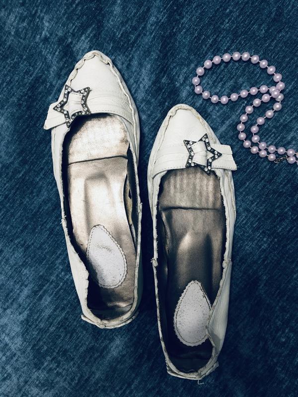 🔥 Стильні🔥 балетки з натуральної шкіри у доброму стані. Розмір вказано 40, але насправді - 39. Повна довжина устілки - 25,5 см. Виготовлені в Італії. Класичний білий колір, який підійде до будь-якої кольорової гамми одягу. Верх, устілка та низ балеток з натуральної шкіри. Прикрашені сріблястою металевою зіркою з кристалами. Зручні та якісні. Задніки ущільнені. Стан гарний, присутні незначні потертості внизу біля підошви (на фото) . Загалом - все добре. 😉👍