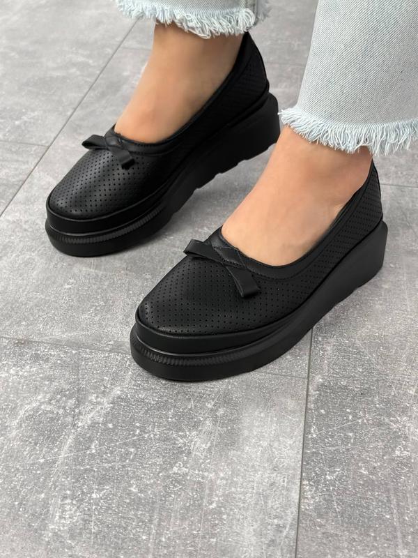 Легкі чорні м'які шкіряні перфоровані балетки на платформі