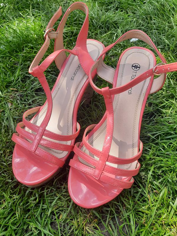 Яркие босоножки на необычном каблуке кораллового цвета размер 38- 39 подойдут на 24.5 см есть нюансы, смотрите на последних фото