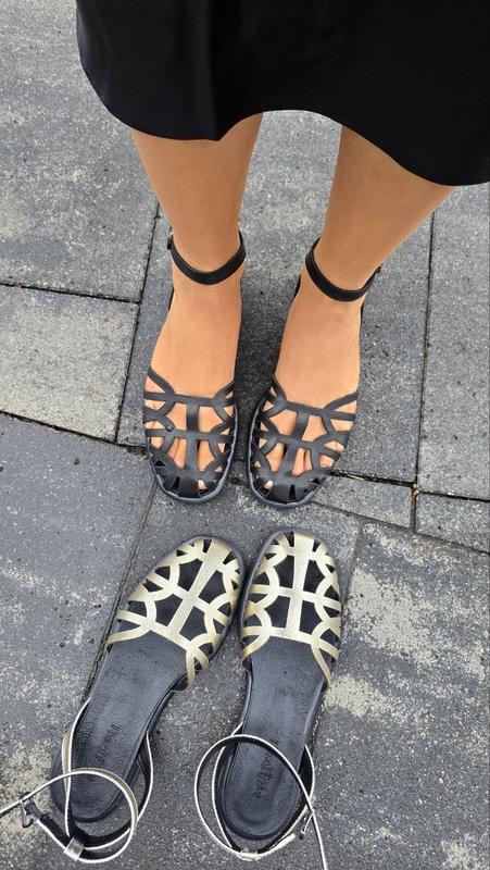 Стильні чорні босоніжки з геометричним вирізом і ремінцем навколо щиколотки. Кольор: чорний та золотисто-сріблястий Матеріал: натуральна шкіра Устілка: шкіра Розміри з 36 по 40: 36 р 23,5 см 37 р 24 см 38 р 24,5-25 см 39 р 25,5 см 40 р 26 см Виробництво України