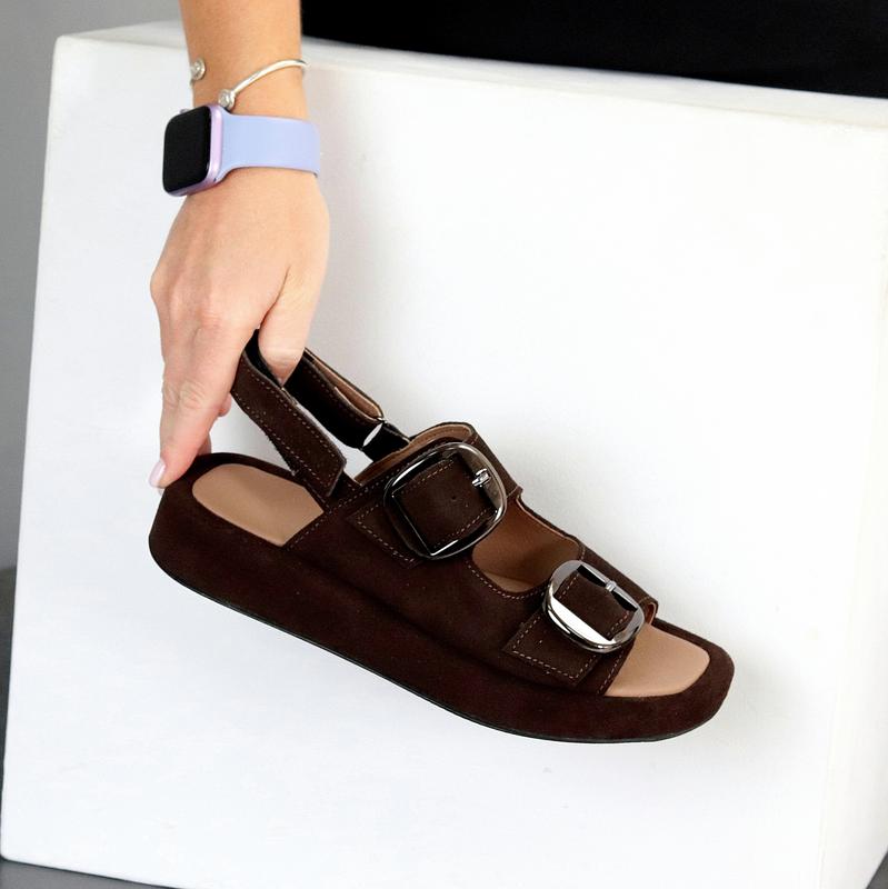 Замшеві босоніжки ремінець + липучка колір гіркий шоколад