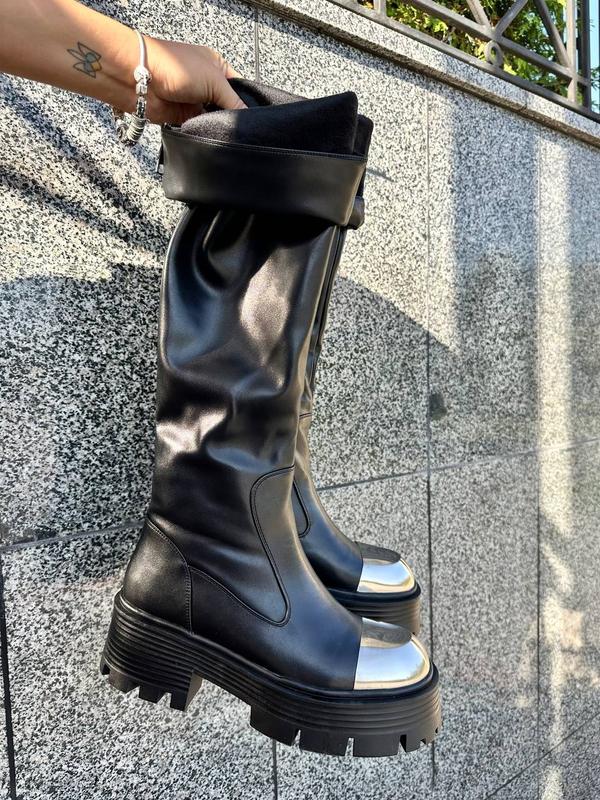 ⚫️код 8272 Ботфорти Матеріал: пресована шкіра преміум класу Сезон: еврозима (густе хутро до щиколотки, верх ворсистий фліс) Об'єм голені регулюється застібкою Висота виробу 52 см Висота підошви 6 см Колір чорний р-сть 36-40 36-23,5 см 37-24 см 38-24,5 см 39-25 см 40-25,5 см