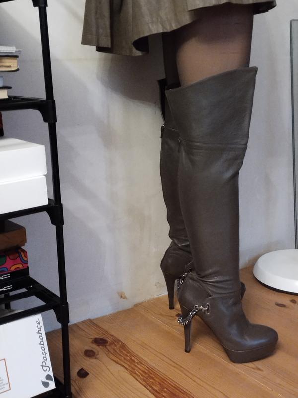 Шикарные ботфорты цвет оливковый кожа мягкая шикарная, смотрятся дуже гарно👍 Девочки это сказка 👍Голенище верх 21 см кокетка 17 см. Икра 16 см щиколотка 11 см каблук 12 см платформа под пальцами 2 см ,ниже 2'5 см высота сапога спереди 60 см высота сзади 48'5 см