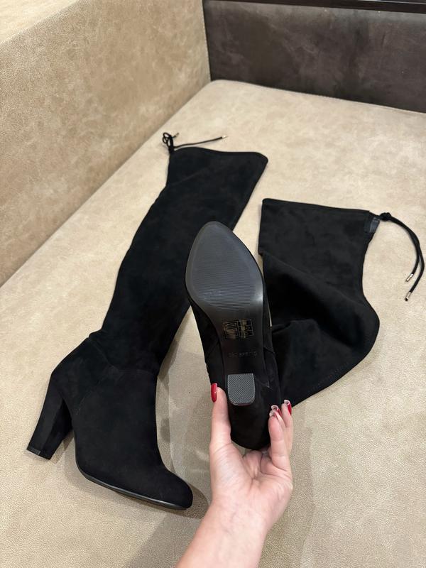 Шикарні ботфорти панчохи на зручному каблуці Розмір вказано 38, по стєлькі 24,5 не на широку ногу Ефектні та зручні Стан нових , наліпки присутні на підошвах, і середина і верх і низ все новеньке Еко замш Застібається зсередини на замок