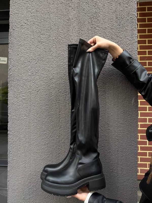 Матеріал верху: стрейчова еко шкіра Всередині: ворсистий фліс по щиколотку, байка по всій довжині Висота: 55-59 см Підошва 3,5-6 см 36-23,5 см 37-24 см 38-24,5 см 39-25,5 см 40-26 см 41-26,5 см Об'єм голені/Об'єм вверху 36р 33-40см 37р 33-40 см 38р 34-41 см 39р 35-42 см 40р 36-43 см 41р 37-44 см 1937