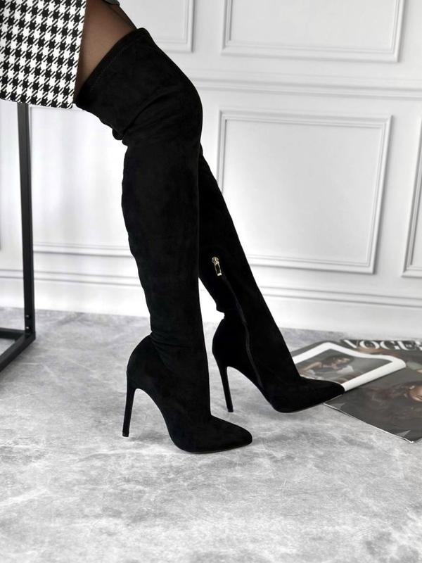 Ботфорти чоботи на підборах з вузьким носком еко замшеві стрейч чорні демі весна осінь з ф...