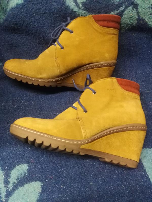 Как новые, обувала всего пару раз. горчичного цвета, натуральная замша, неубиваемая подошва. На стопу 25 см.