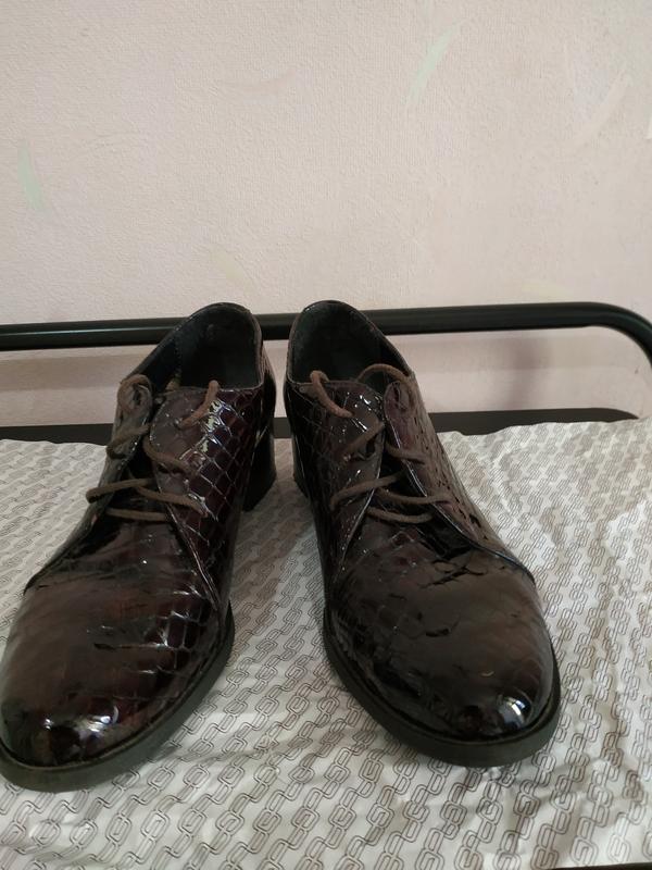 Продам зручні та практичні ботильйони з натуральної лакованої шкіри, тиснення ,,змія,, в ідеальному стані. Колір темного шоколаду. Каблук висотою 4 см, шнуровка. Виробник вказує розмір 39, але мій розмір 40 і підійшли ідеально.