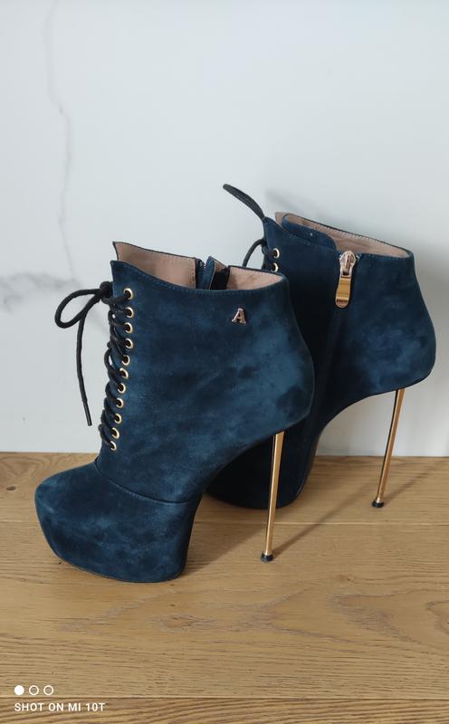 Темно синие,очень красивого цвета замшевые ботильоны ,размер 35,(пишет),но подойдёт на 36 Замш,внутри кожа Обуты пару раз Чуть стёрты набойки(указано на последнем фото)