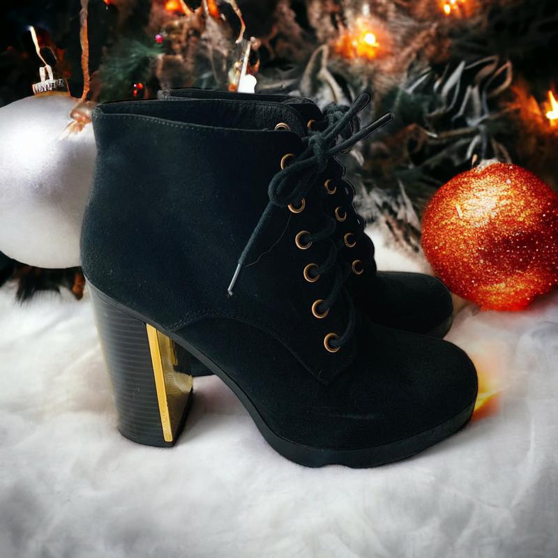 Продам стильні ботильйони на стійких підборах. Колір - глибокий чорний, матеріал - замша, що надає взуття елегантності та універсальності. Золота деталь на підборах додає вишуканий акцент і робить цю модель особливою. Зручне шнурування забезпечує ідеальну посадку на нозі. Підійдуть як для повсякденного образу, так і для особливих випадків. Ваші ноги будуть у центрі уваги! Розмір: 39, ідуть на 38 розмір