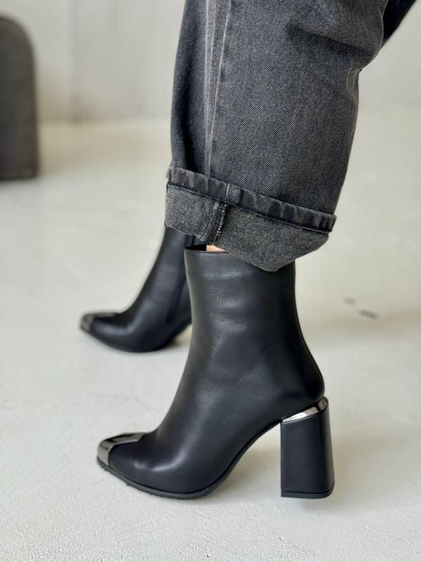 Код 101106- натуральна замша Код 101107- натуральна шкіра Черевики на підборі з акцентною фурнітурою. Підошва спереду 1см, підбор 8 см. Висота від п'яти 13 см. Обхват зверху 25-27 см. Розмірний ряд: 36-40 Колір: чорний . Зроблено в Україні. 3750 грн.