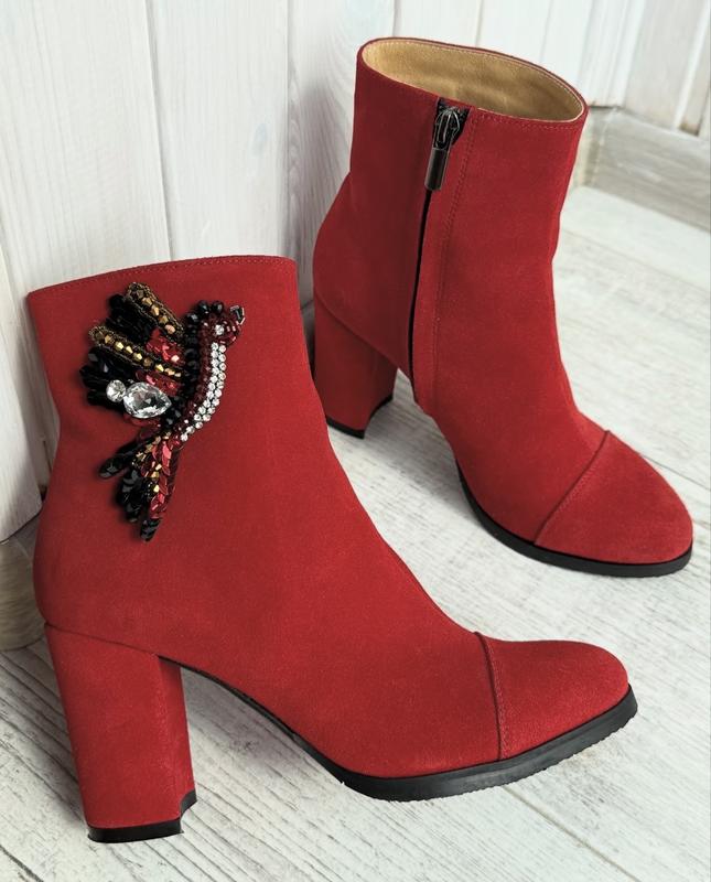 Дуже ефектна пара черевичок з натуральної замші від Modern Fashion 😍 ▫️Стан: ідеальний, черевички буквально раз одягнені, але збоку помітила трохи темніший колір, гадаю це момент транспортування (останнє фото), в носці взагалі не буде видно ▫️Матеріал: натуральна замша, всередині утеплювач ▫️Розмір: 37 (24 см), підбор 8,5 см