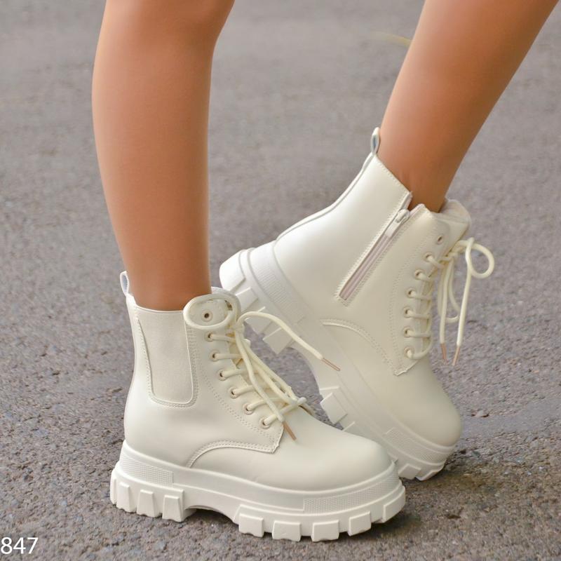 Код 847 Жіночі черевики Колір - Світлий Біж Матеріал верху: штучна шкіра Матеріал підкладки: штучне хутро підошва 5см Висота 13см Виробник: Китай 36-23см 37-23 5см 38-24 см 39-25 см 40-25,5 см 41-26 см на примірці устілка нарізана не правильно не орієнтир