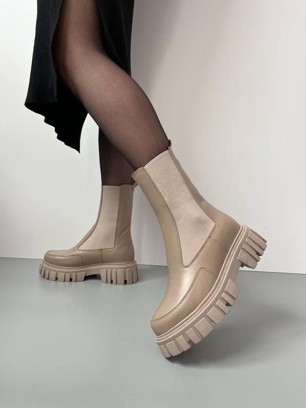 Стильні високі челсі Код 4925 Сезон-зима Колір-беж Натуральна шкіра Натуральне хутро Висота від п‘яточки 20 см Висота підошви 5 см Виробник Україна Розмірна сітка: 36-23.5 37-24 38-24.5 39-25 40-25.5-26