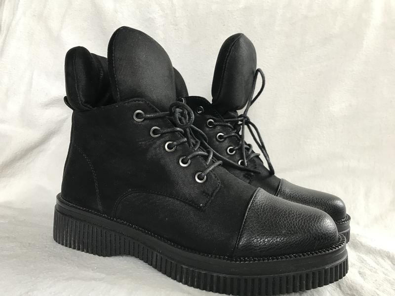 Ботінки, еко-замш на шнурівках, по устілці 23 см. Всередині типу фліс( начосик невеличкий). Язичок має об’єм. Можу сфоткати на ніжці.Відправляю новою поштою та укрпоштою. Нові.