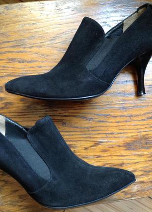 Ботинки натуральный замш чёрного цвета,на каблуке.Справа и слева от центрально шва резиновые вставки,хорошо фиксируют ногу.Благодаря им нога чувствует себя очень комфортно в ботинке.Несколько раз обуты,родная,фабричная набойка.В верхней части пятки декор (металлический элемент со стразом).Высота каблука 8 см,длина стельки 23 см.Очнь изящные и элегантные.Смотрите мои другие объявления,ещё есть обувь на последней странице.