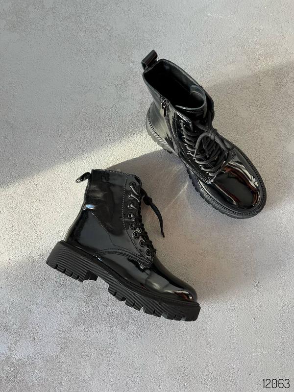 Код 12063 Черевики ДЕМІ Натуральний лак Колір Black Всередині фліс Висота від підошви 14см Підошва 4,5см-3,5см Розмір у розмір 36-23,5см 37-24см 38-24,5см 39-25см 40-25,5см 41-26см