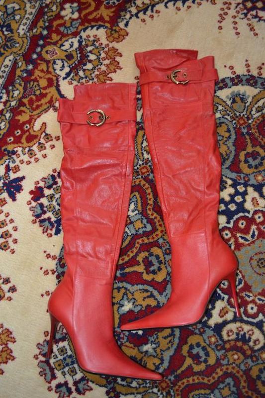 Шикарні червоні ботфорти з натуральної м'якої шкіри! На баечке всередині! Комфортні! Збоку на замочку. на одній парі на мою 38р на п'яті непомітний дефект рахунок при транспортуванні Розмір 38, устілка - 24.5 див. Розмір 39, устілка - 25. див.