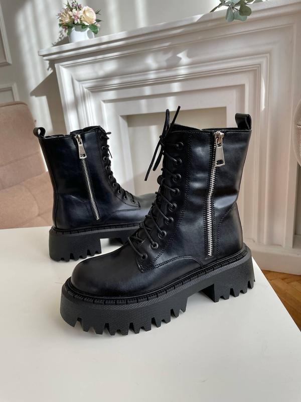 Шкіряні черевики чорного кольору з замком на масивній підошві Сезон: Зима( хутро штучне ) Платформа: 3-5 см Висота: 17 см ( до п'ятки ) На середню ніжку Розмір в розмір Розмірна сітка: 36 - 23,5 см 37 - 24 см 38 - 24,5 см 39 - 25 см 40 - 25,5 см Ціна 1500 грн Код 9794