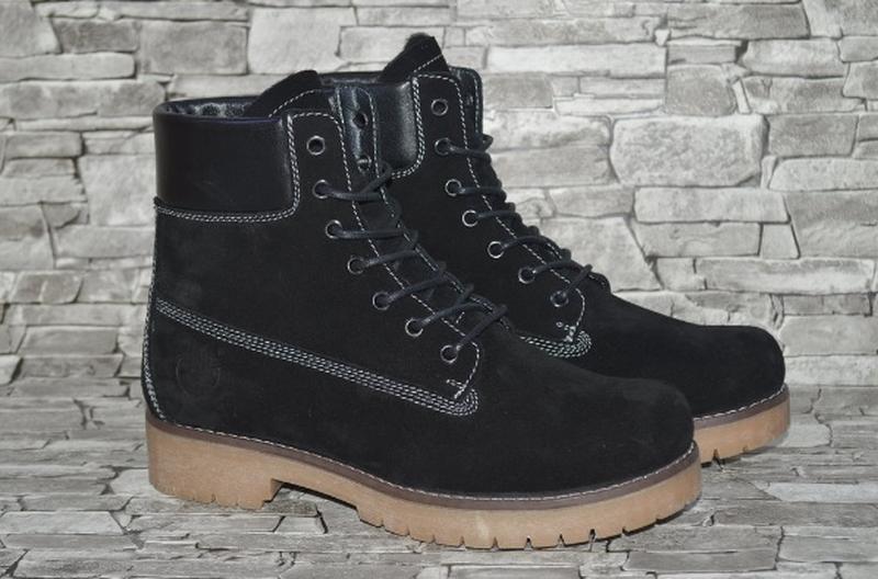 Зимові шкіряні черевики в стилі Timberland, вир-во Україна. Верх - натуральний нубук, всередині повністю на хутрі, добротна проклеєна та прошита неслизька підошва. Розмір 40, довжина устілки 26 см, ширина устілки 8,5 см, каблук 3,5 см, танкетка 2 см, висота задника 15 см. Відмінна якість. Без коробки.