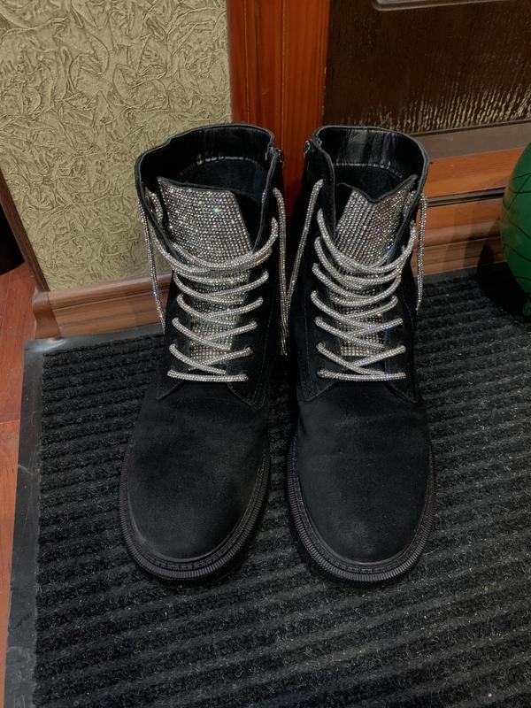 Дуже блискучі сяючі чобітки, застібаються на замочок, натуральна замш, потрібно буде пофарбувати і привести до ладу, камінці на місті… при штучному світлі, блистять нереально😍