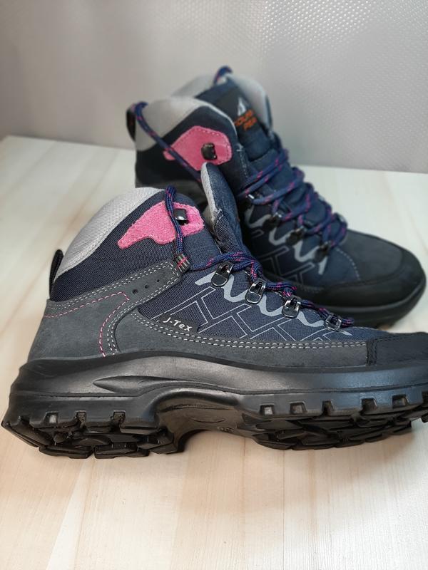 жіночі трекінгові черевики в гарному стані, розмір 39. 25 см Модель у темно-синьому кольорі з рожевими вставками, шнурівка виготовлена з використанням міцних матеріалів. Верх взуття зроблений із текстилю та шкіри, підошва має високу міцність і зчеплення з поверхнею. Зручні та стильні черевики підійдуть для активного відпочинку та повсякденного використання. Виробник: J-Tex.