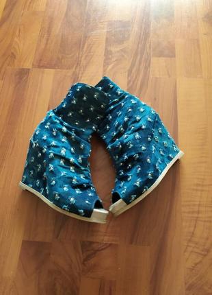 Джинсові черевички,щільний якісний джинс,в дірочки. Одягнені пару раз, стан відмінний, сліди шкарпетки тільки трохи на підошві та подряпина зовсім не велика на носку - див. фото,при носінні абсолютно непомітно. Розмір 38,устілка 24,5 - 25 см, платформа ззаду 10 см, спереду 2 см