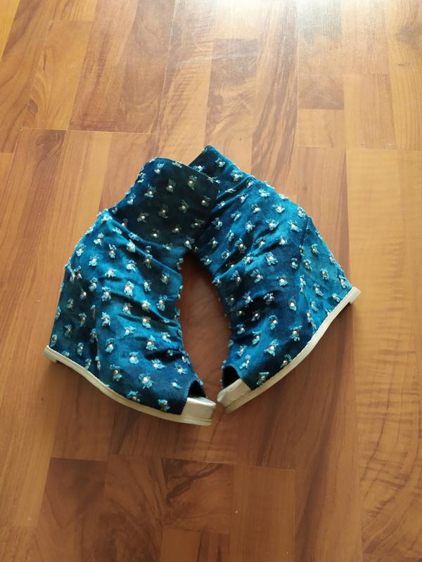 Джинсовые ботиночки,плотный качественный джинс,в дырочки. Одеты пару раз, состояние отличное, следы носки только немного на подошве и царапина совсем не большая на носке- см. фото,при носке абсолютно незаметно. Размер 38,стелька 24,5- 25 см, платформа сзади 10 см, спереди 2 см
