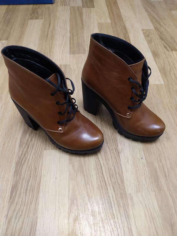 Шкіряні, размер40.Не дивлячись на каблук, дуже зручні. Стан відмінний,один мінус - кілька подряпин - дивитися на фото.Кремом ще не мазала , так що проблемка відразу зникне.