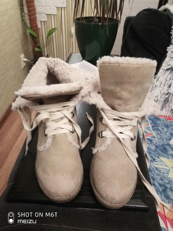 черевики еко замш з овчиною фірми H&M, імітація затертостей, куплені в Польщі, вдягалися по декілька разів, не ношу каблуки і танкетки , але зручні навіть мені на ногу 25-25.5 см, висота танкетки 9см, ідеальний стан 5/5