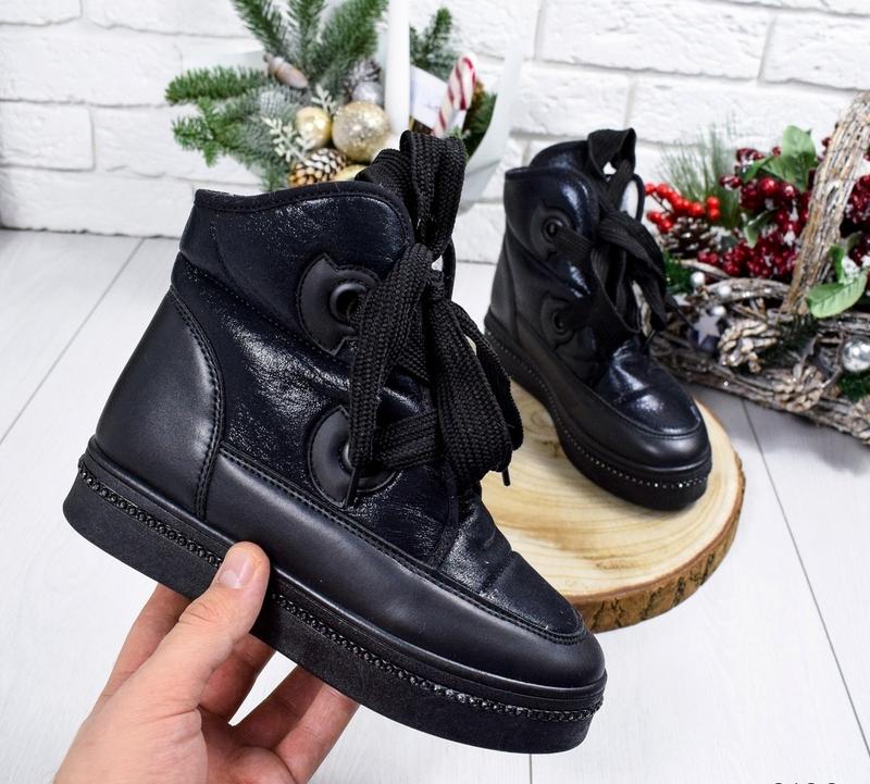 Черевики дутики жіночі Duo чорні Код: 9199 Матеріал: еко - шкіра + плащівка Колір: чорний Всередині : еко - хутро підошва 3,5 см, висота від п'ятки 12см Розміри 36-41 36-23,5 см 37-24 см 38-24,5 см 39-25,5 см 40-26 см 41-26,5 см 525 грн