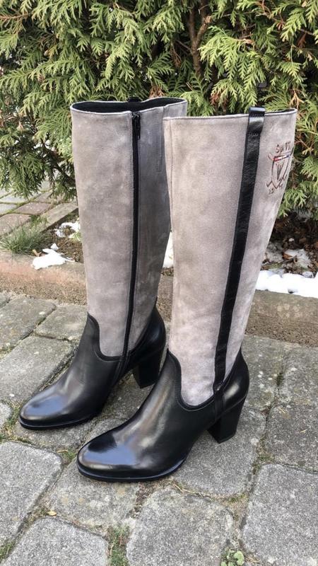 Демосезонні жіночі чоботи . Виробництво Іспанії . Виготовлені з натуральної шкіри чорного кольору в поєднані з замшею сірого кольору. Чоботи на стійкому каблуку , висотою 8 см.