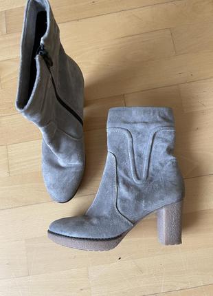 Ботинки замшевые серого цвета 39 размера. Бренд Manas. Подкладка текстиль. Стелька 26 см, подойдут и на 39,5/ 40. Высота голенища 17,5 см, платформа 1,5 см, каблук 8 см. Охват голенища30 см. Новые, без дефектов.