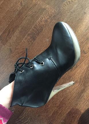 Ботильйоны на высоком каблуке. Шпилька очень удобная - 12 см. Платформа - 2 см. Носила и под джинсы, и под юбки/платья. Немного откололся материал на подошве (видно на фото) и потерся чуть-чуть козжам (тоже на фото видно)