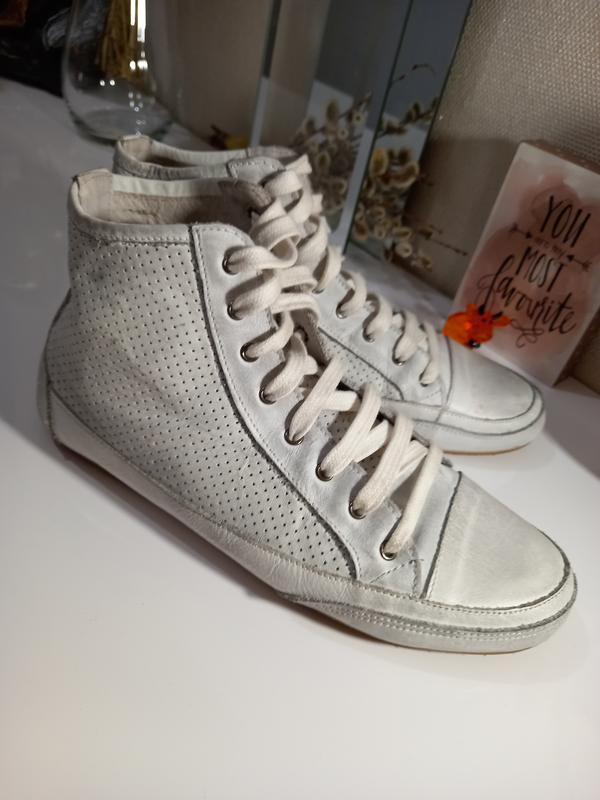 фирменные женские итальянские кеды lider в идеальном состоянии практически без следов использования, есть небольшие потертости на подошве в стандартных местах, изготовленные из натуральной кожи, цвет белый с сероватыми затемнением, производитель Италия размер 37, длина стельки 23,5 см пятка 5 см носок 8 см