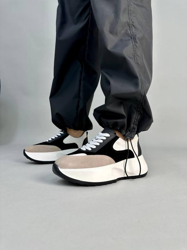 Жіночі кросівки білого кольору з чорними та бежевими вставками на платформі заввишки 4-5,5 см. Виготовлені з натуральної замші та шкіри, всередині шкіряна підкладка. Матеріал підошви поліуретан. Виробник Україна. Розміри: 36-23,5 см 37-24 см 38-24,5 см 39-25 см 40-26 см 41-26,5см