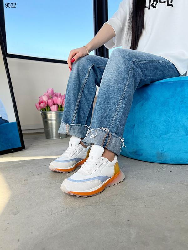 код 9032 Кросівки АВ 🔹Натуральна шкіра + замша усередині шкірпідклад, 🔹колір WHITE - orange ▫️підошва спереду 2,5 см позаду 4 см дуже легкі та зручні ❤️Топ якість 🔹розміри 36-40 🔸виробництво Харків 37=24 см 38=24,5 см 39=25 см 40=26 см