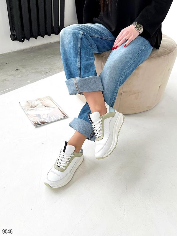 код 9045 Кросівки 🔹Натуральна шкіра усередині шкірпідклад, 🔹колір WHITE - green ▫️підошва спереду 2,5 см позаду 4 см 🔹розміри 36-40 🔸виробництво Харків 36=23,5см 37=24 см 38=24,5 см 39=25 см 40=26 см