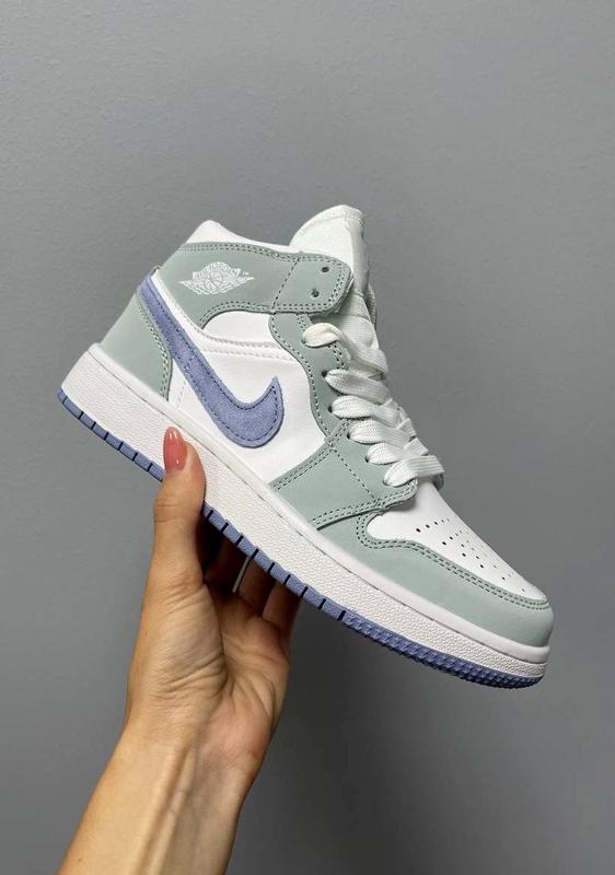 Красиві жіночі високі кросівки nike air jordan 1 retro mid green blue сіро-блакитні з біли...